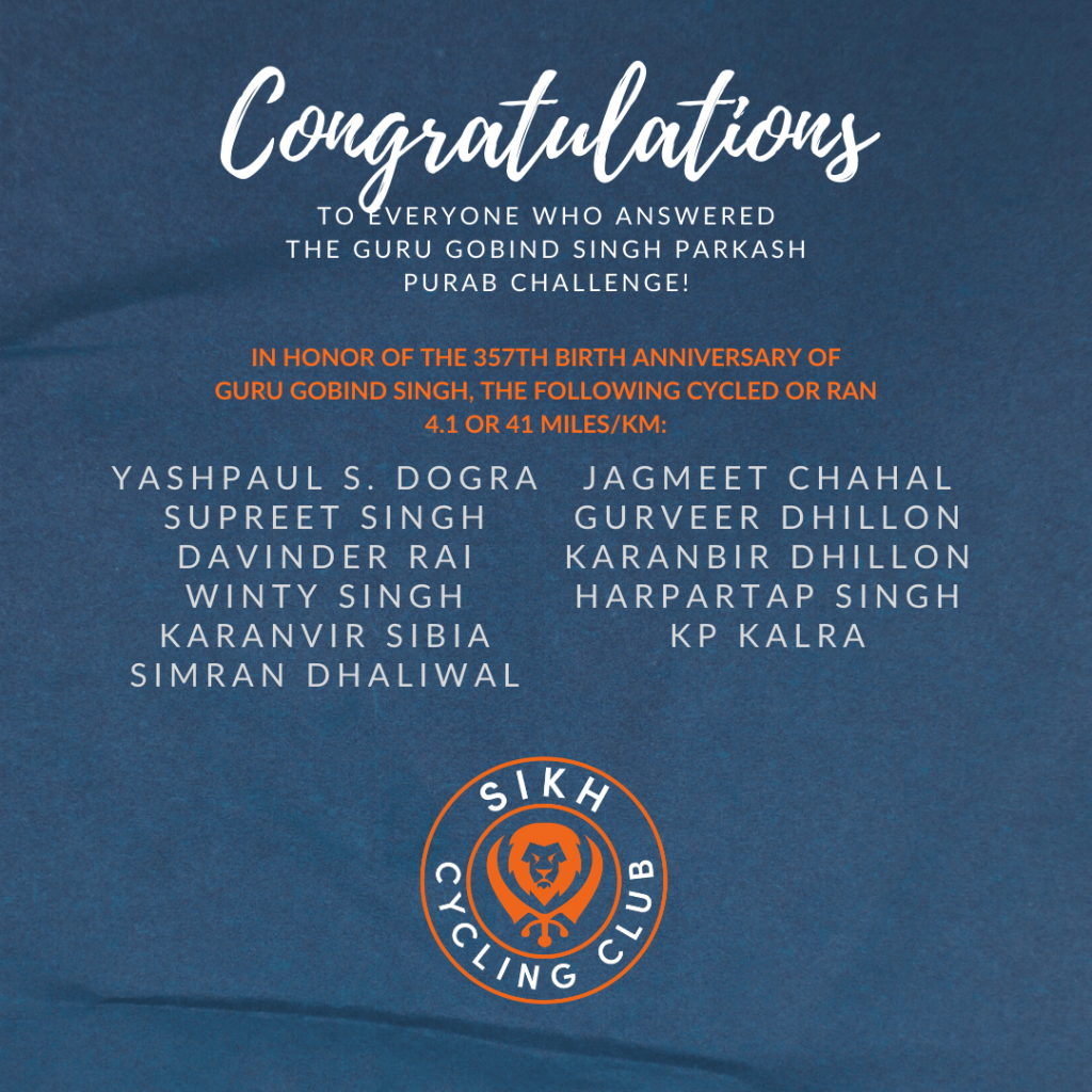This past week, the Sikh community commemorated the 357th anniversary of the birth of Guru Gobind Singh, the 10th Guru of the Sikhs. Our way to celebrate this was to challenge our club to run or cycle 4.1 or 41 miles or kilometers — one unit of distance for every year of Guru Gobind Singh’s life.
